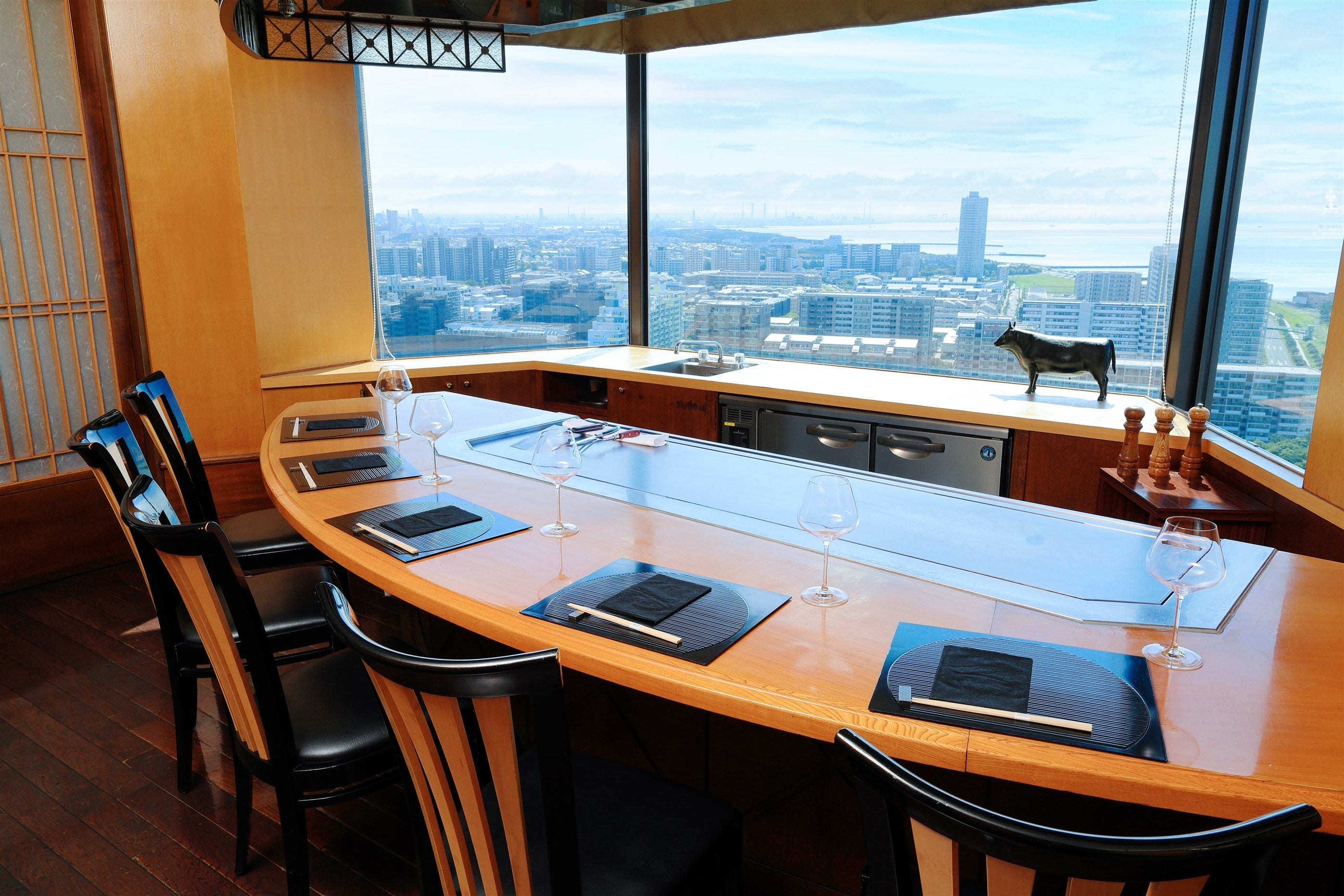 ホテル最上階で過ごす特別な時間。カウンター越しにシェフが鮮やかな手捌きで焼き上げるステーキや野菜の音や香りも存分にご堪能いただけます。眼下一面に広がる東京湾を眺めながら至福のひと時をお過ごしください。