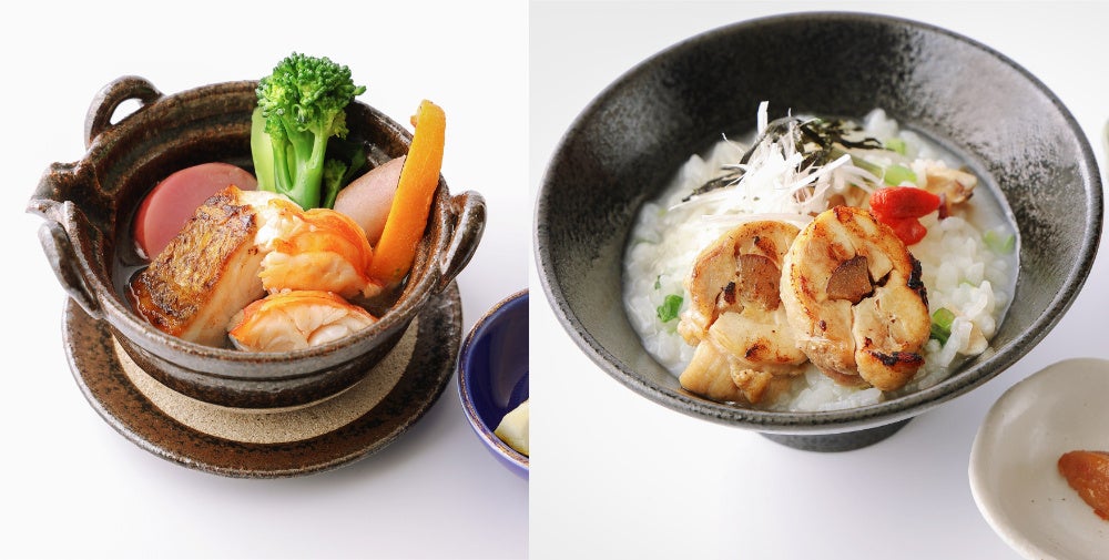 “海老原ファームから届くエビベジ & 海の幸の土瓶蒸し仕立て”は野菜本来の美味しさを追求する海老原ファームで収穫された味わい深い“エビベジ”に加えて厳選された海の幸をこぶ出汁とともに蒸した逸品。旨みたっぷりの出汁をスープとしてもお楽しみいただけます。〆の” 薬膳薫る参鶏湯風の〆雑炊 高麗人参梅干を添えて“は鶏もも肉と薬味をニューオータニのチキンブイヨンで柔らかく煮込んだ雑炊。高麗人参と一緒に付け込んだ南高梅と一緒にお召し上がりください。
