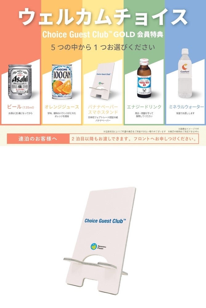 GOLD会員限定特典。公式サイトから予約すると、チェックインの際に、ビール・オレンジジュース・バナナペーパースマホスタンド・エナジードリンク・ミネラルウォーターの合計5種類の中から1種類を必ずプレゼントします。※一部ホテルのぞく