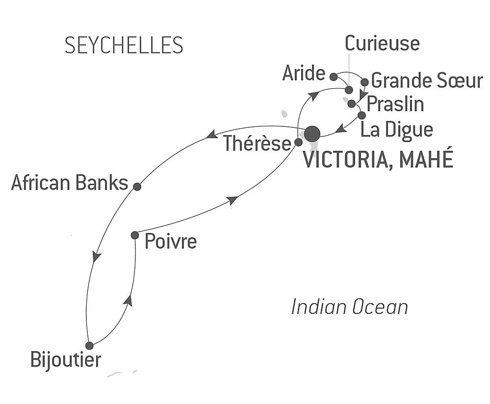 花崗岩と珊瑚礁に囲まれた素晴らしいセーシェル諸島を新発見いただける航路です。