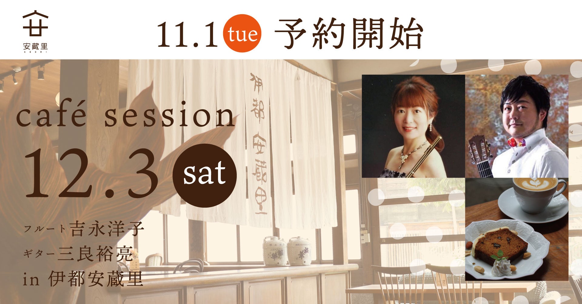 「café session」三良裕亮×吉永洋子in伊都安蔵里このたび、伊都安蔵里では、吉永洋子さん、三良裕亮さん、を招いて「café session」を開催いたします。築170年の醤油蔵をリノベーションした糸島の店舗にてフルートとギターの生演奏を聴きながら、ケーキとコーヒーを楽しめる至福のイベントとなっております。豊かで華やかな音色の共演をお楽しみください。