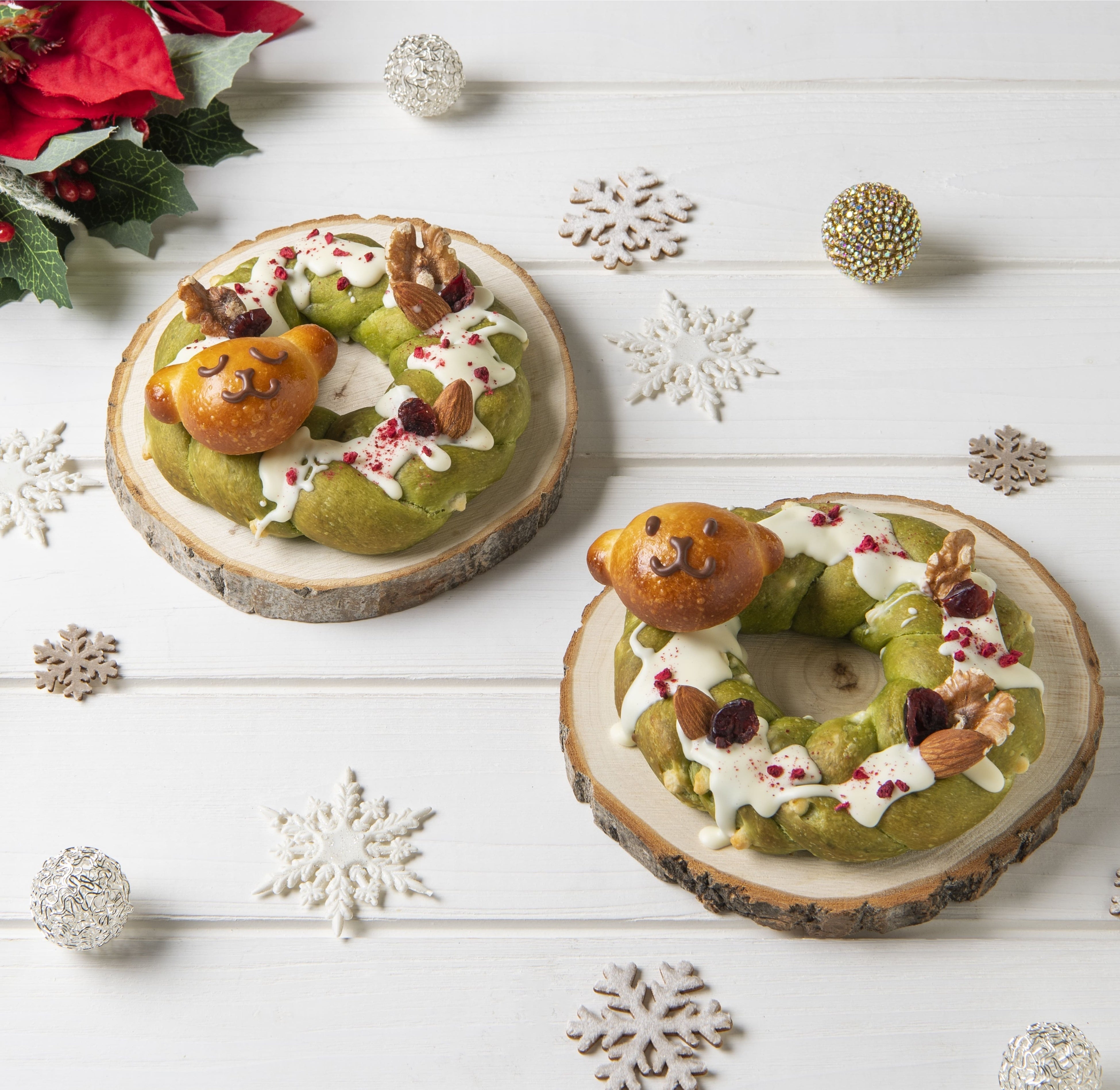 リースをイメージして、抹茶風味の生地にドライフルーツやナッツで飾り付けました。