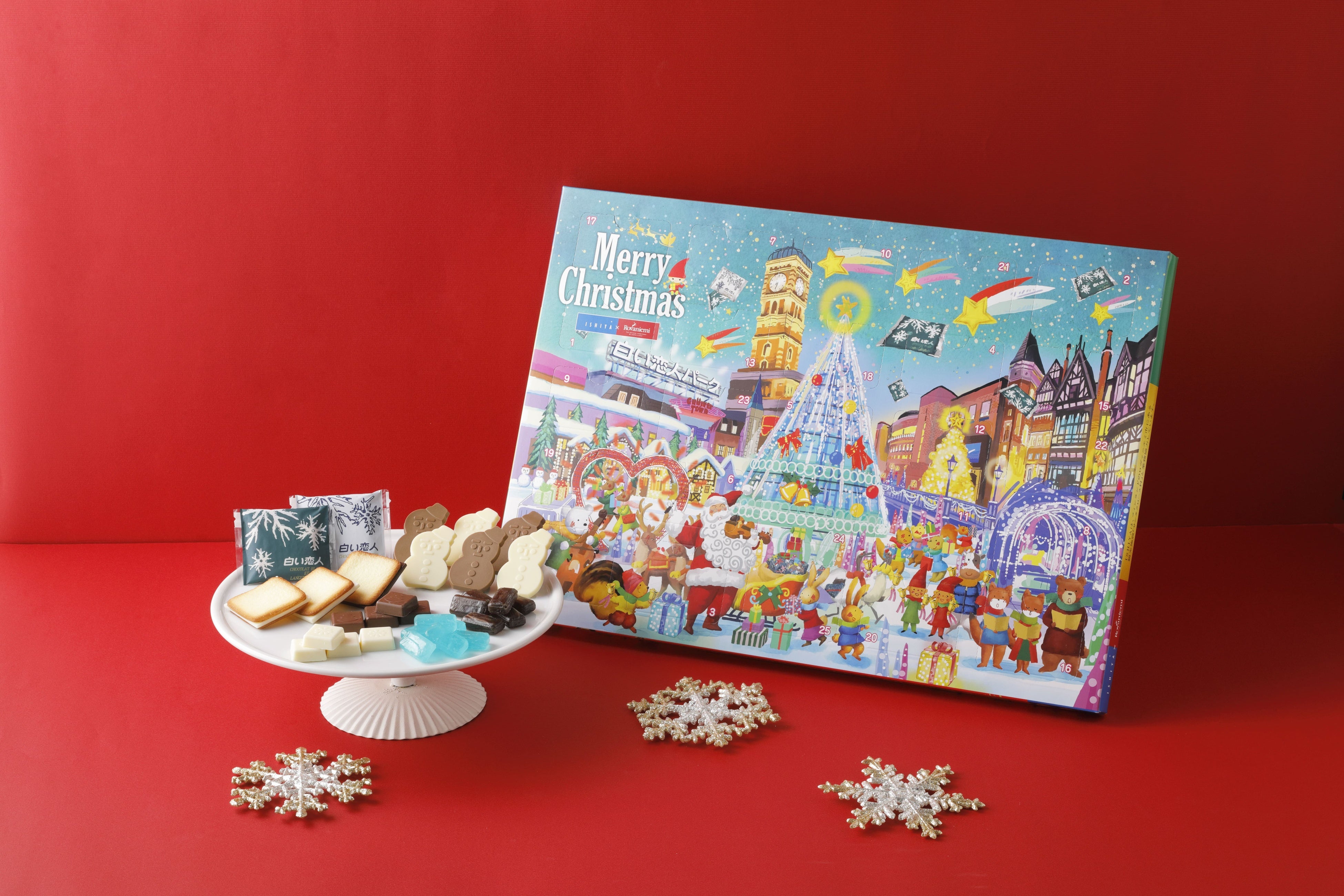 「白い恋人」をはじめ、イシヤのいろいろなお菓子が楽しめるサンタクロースと愉快な仲間たちがデザインされたアドベントカレンダーです。