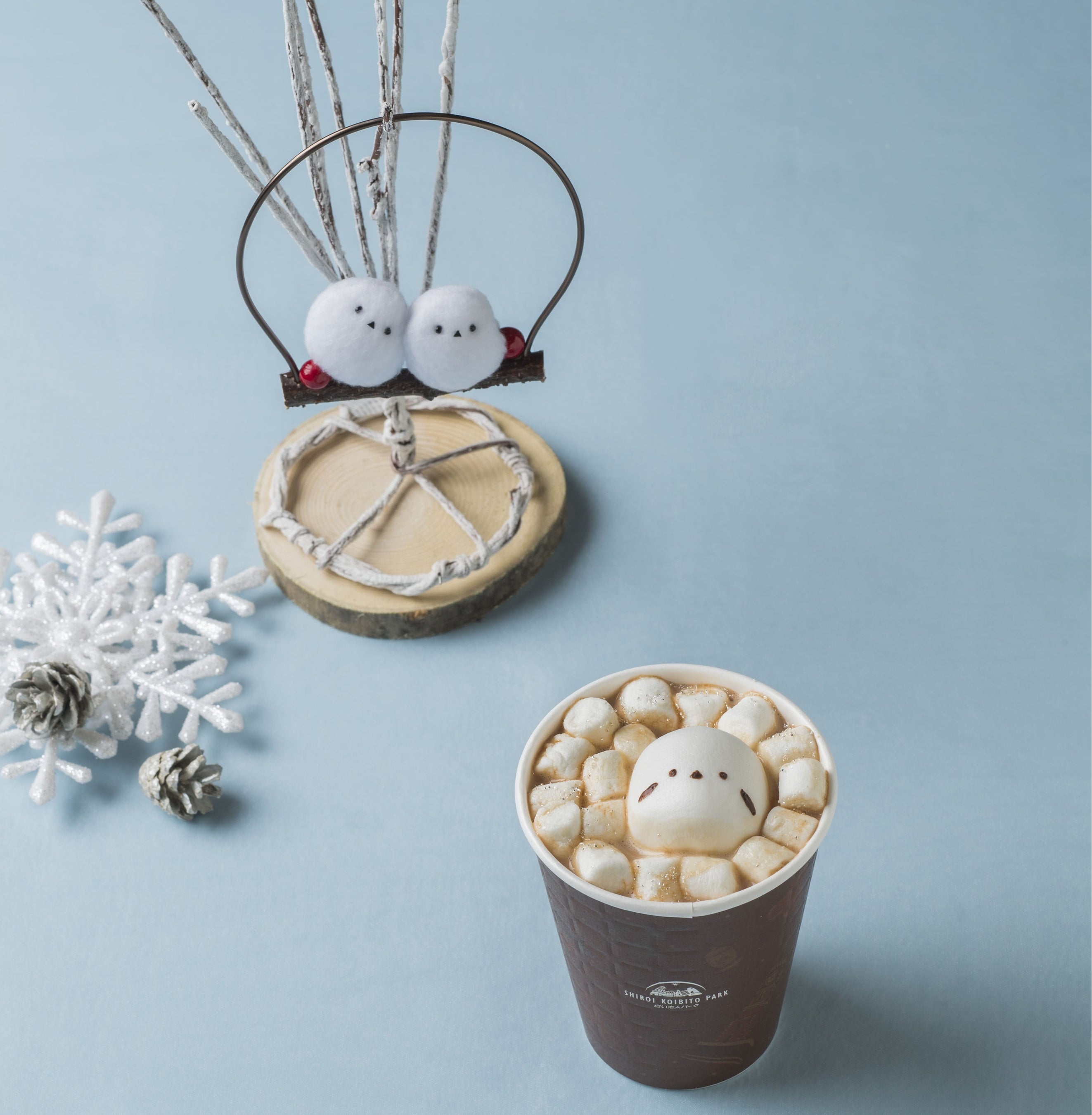 チョコレートドリンクにシマエナガに見立てたマシュマロをトッピングしました。