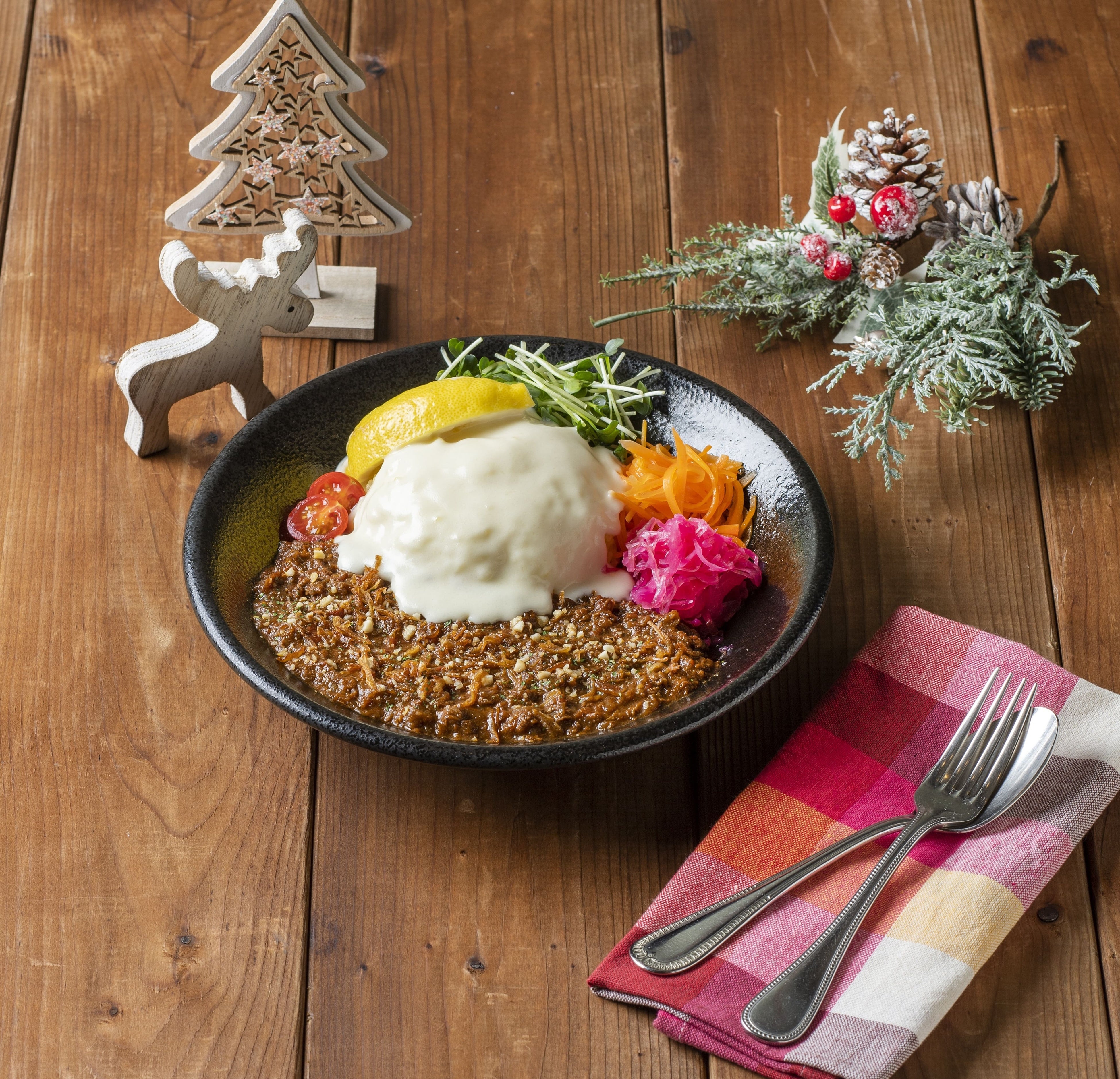 8種類のスパイスを使用した本格的なスパイスカレー。ホワイトクリスマスをイメージしたチーズソースとの相性も抜群です。