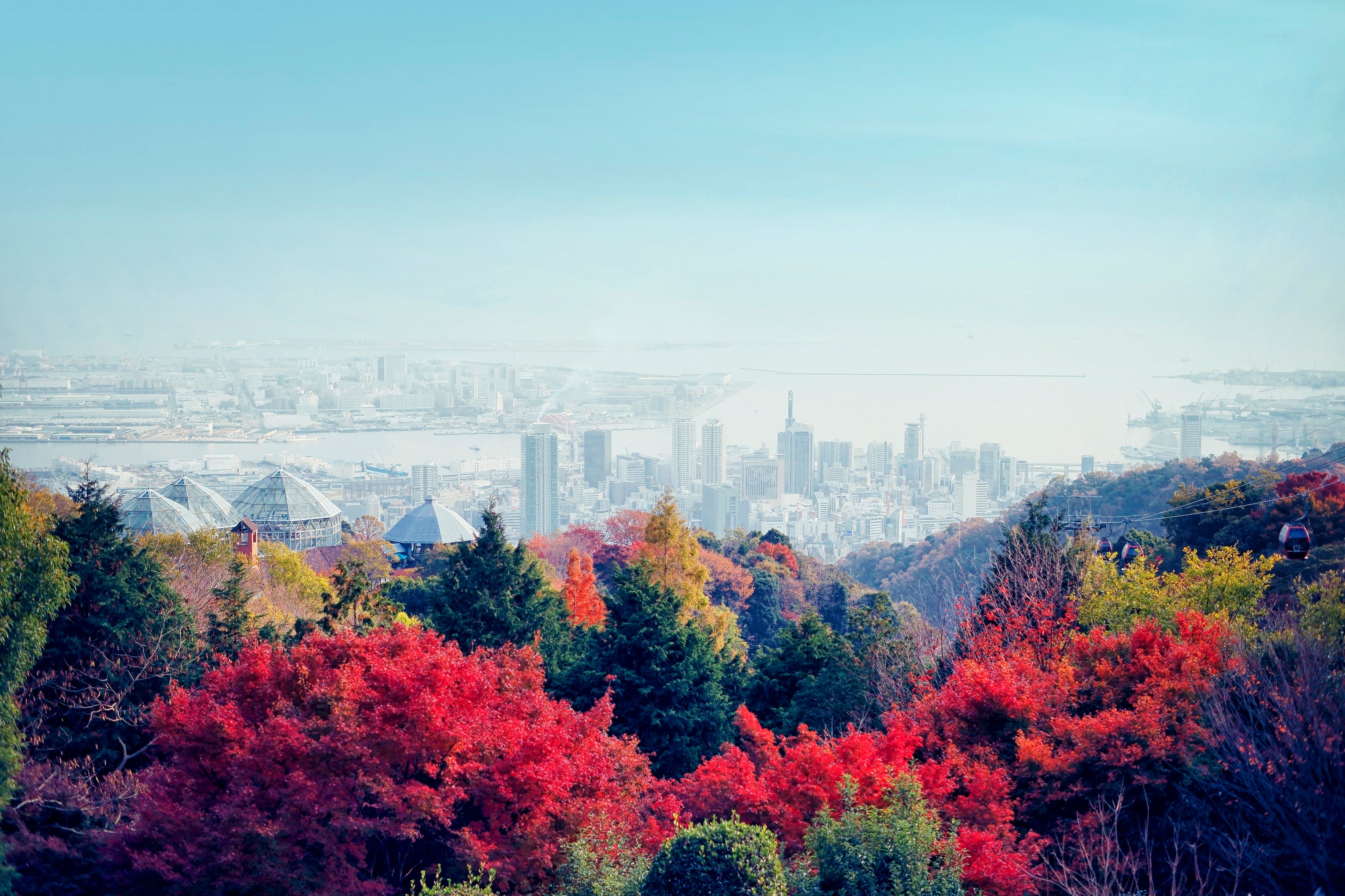 ロープウェイや山頂の展望プラザ(標高約400m)、ガーデン各所、風の丘芝生広場(標高約250m)から、紅葉越しの美しい神戸の街並みも望める、神戸随一の紅葉の名所です。