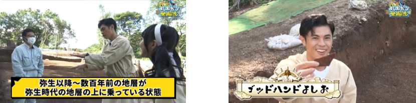 吉野ヶ里遺跡にやってきた小島よしおさん。復元した竪穴住居から登場し、はじめにひぜんりささんから吉野ヶ里遺跡の簡単な説明を受けます。その後、弥生時代の衣服「貫頭衣」に着替え、二人で発掘調査に挑戦します。