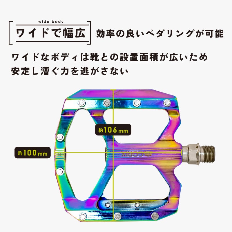 ワイド(幅広)のボディは靴との接触部分が広く漕ぐ力を逃がしません。