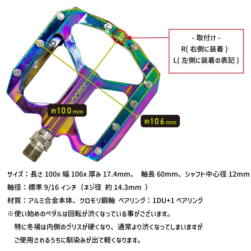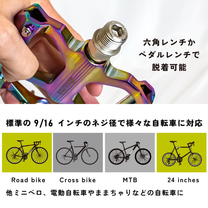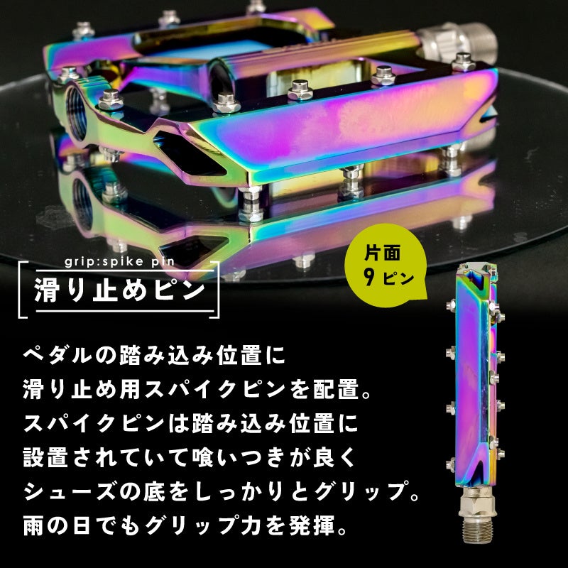 両面のペダル踏み込み位置に滑り止め用のスパイクピンを配置。
