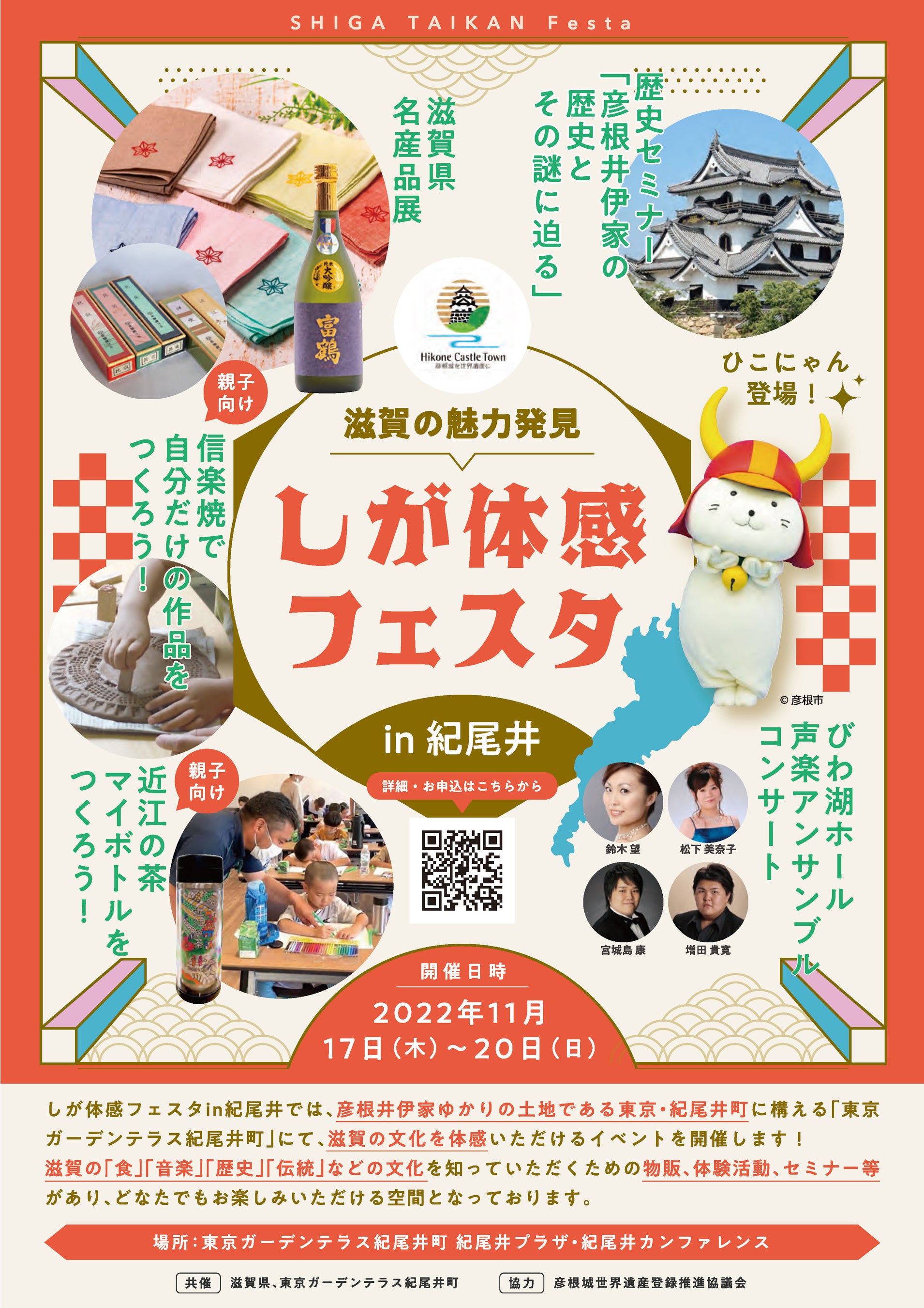 令和4年11月17日(木)から11月20日(日)までの期間、彦根井伊家ゆかりの土地である東京・紀尾井町に構える「東京ガーデンテラス紀尾井町」にて、滋賀の文化を体感いただけるイベント「しが体感フェスタin紀尾井」を開催します!