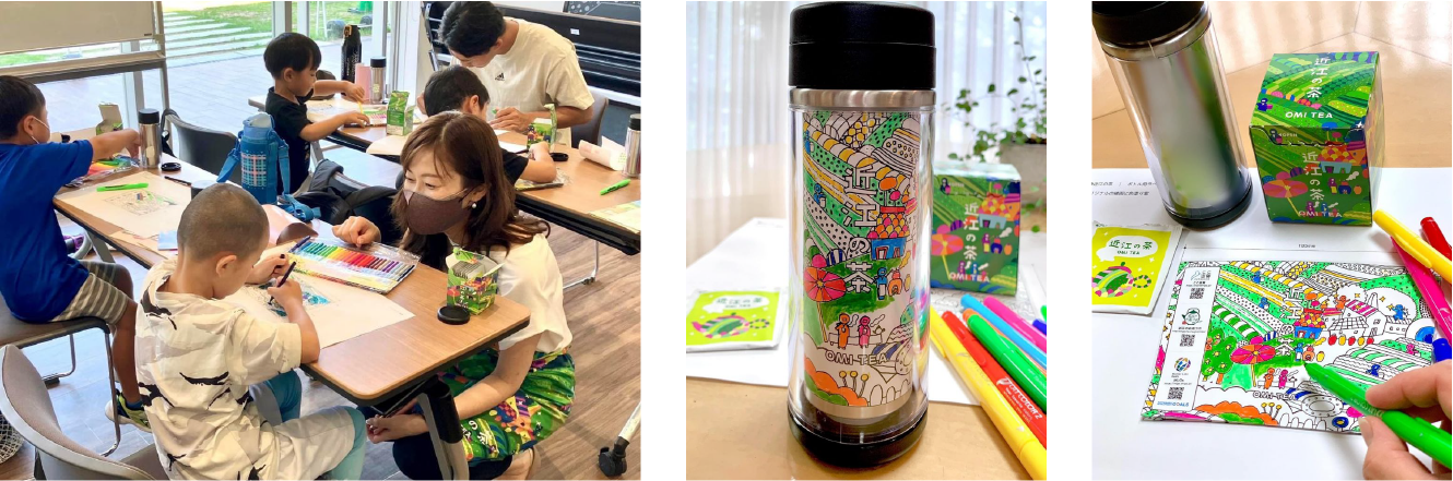 近江の茶のラベルに色を塗り、自分だけのマイボトルを作成いただきます。そののち、日本茶発祥の地と言われる近江のお茶を皆さんで楽しんでいただき、同時に滋賀のお茶文化について知っていただく機会とします。