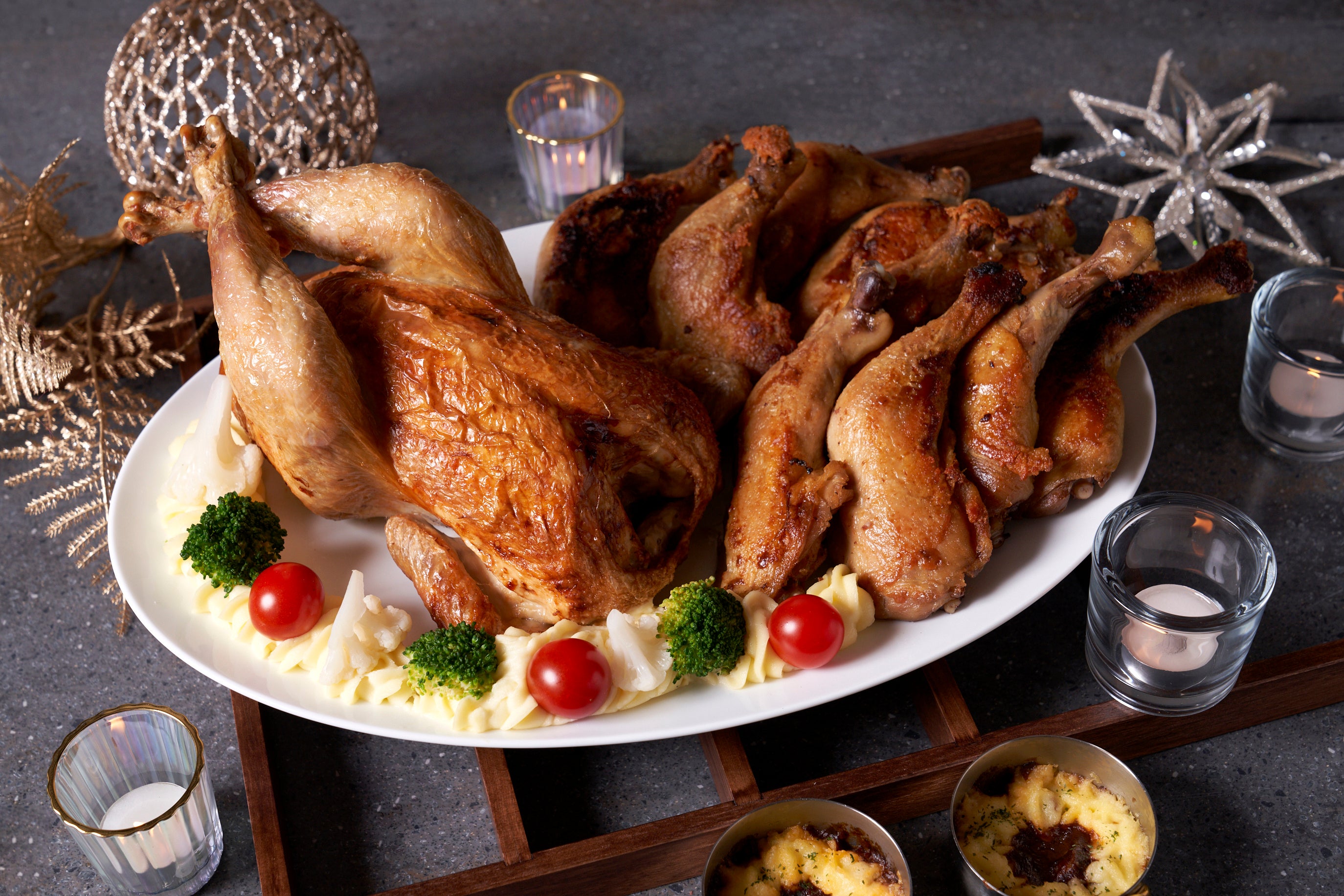 クリスマスブッフェのローストチキンはスパイスをまぶしてローストする前に、 コンフィ(低温の油でじっくりと煮た料理)していますので、とても柔らかく 仕上がっています。