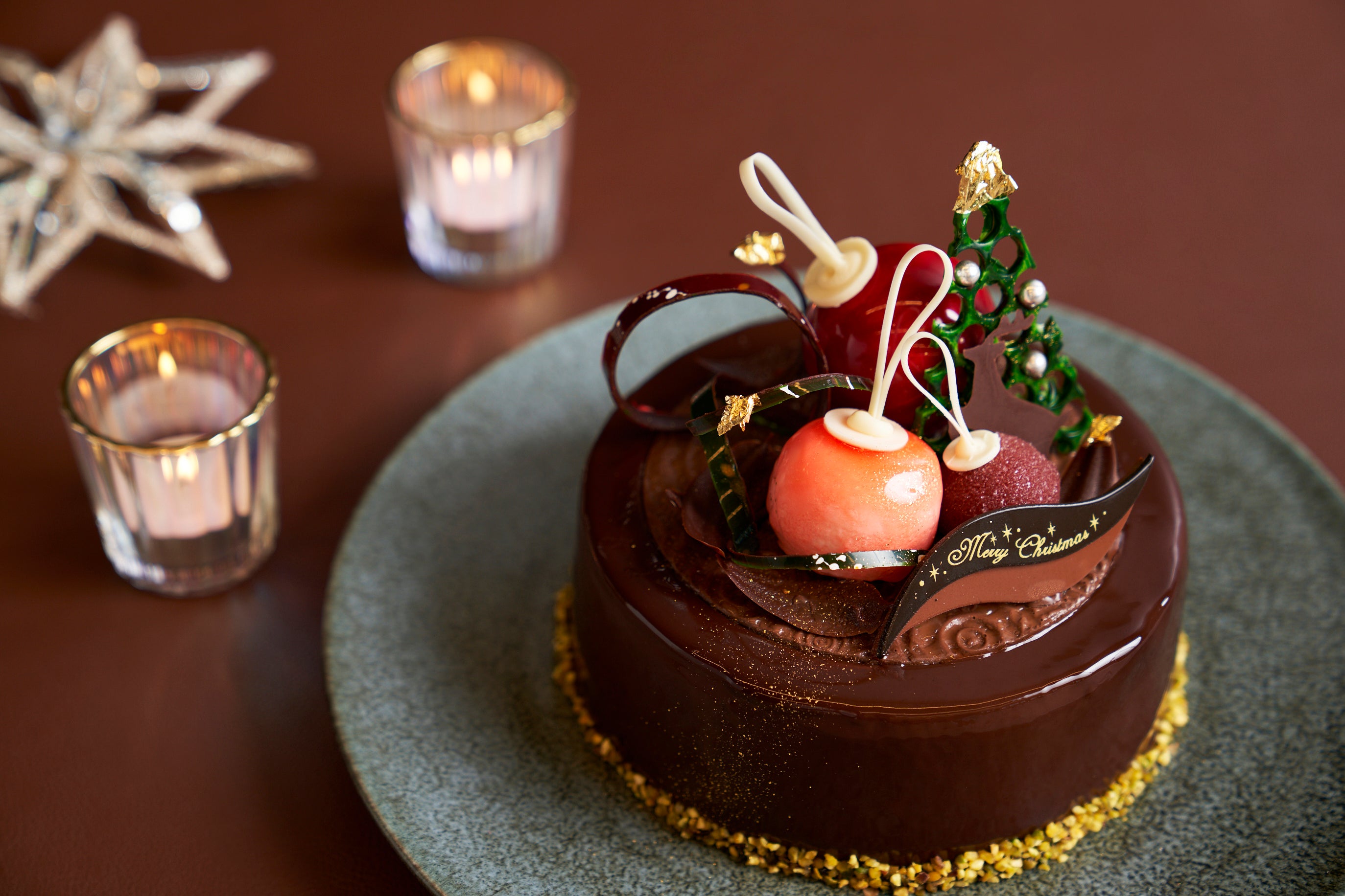 ケーキ本体はフランスにあるヴァローナ社のショコラを贅沢に使用したムースを ベースに、中には口どけの良いショコラスポンジ、グリオットクリームと濃厚なピスタチオ ムース、サクサク食感のフィアンティーヌも使用したクリスマスだけの特別な一品。 クリスマスツリーをイメージしたトップの飾りのクリスマスオーナメント 3 種にも 様々な味が隠されており、見た目と味両方で楽しめる聖なる夜に相応しいケーキです。