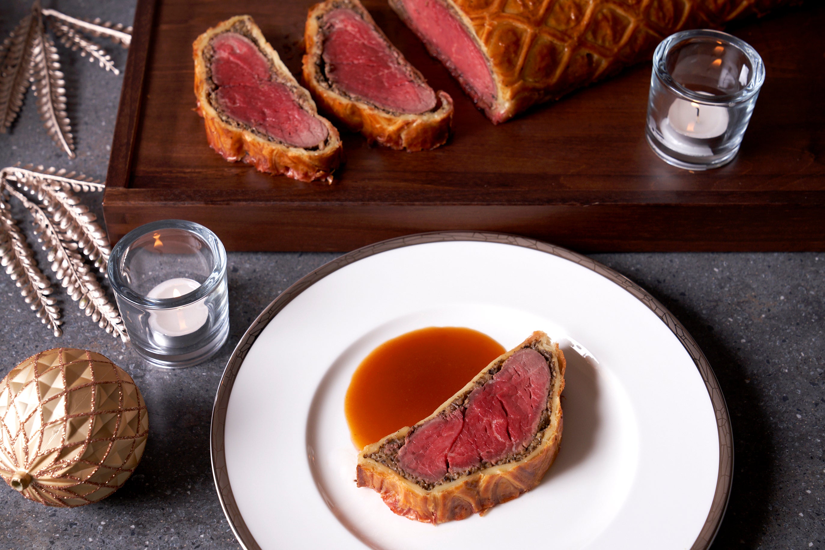 フィレステーキ用の牛肉を、キノコ、玉ねぎ、エシャロットなどを細かく刻んで バターなどで炒めたデュクセルで覆い、さらにその上からパイ生地で包んで オーブンで焼き上げました。イギリス地方でよくクリスマスに食される料理です。