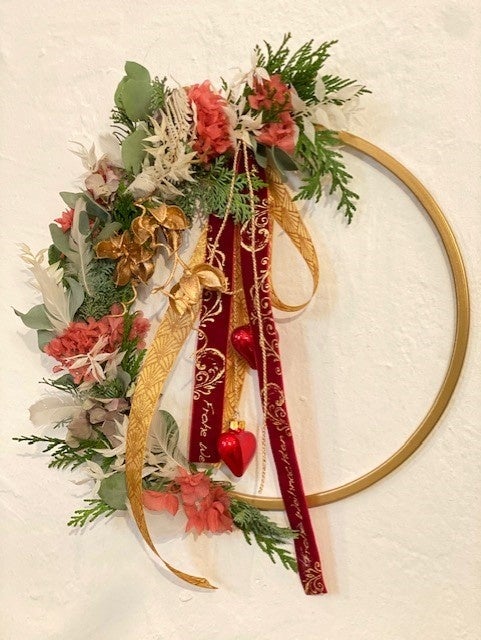 クリスマスを彩る、プリザーブドフラワーやナチュラルな素材を組み合わせたリースを制作します。プレゼントにもぴったりです。