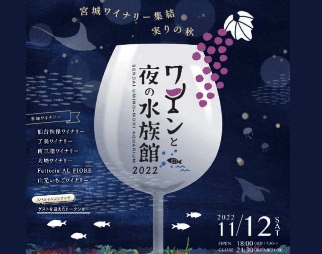 厳選されたワインと、ワインとのマリアージュを楽しめるイベント限定のフードメニューも一緒にお楽しみいただけます。さらに、館内では各ワイナリーによるトークショーも開催!幻想的な夜の水族館で、宮城ワインの魅力をたっぷり楽しめるイベントです。