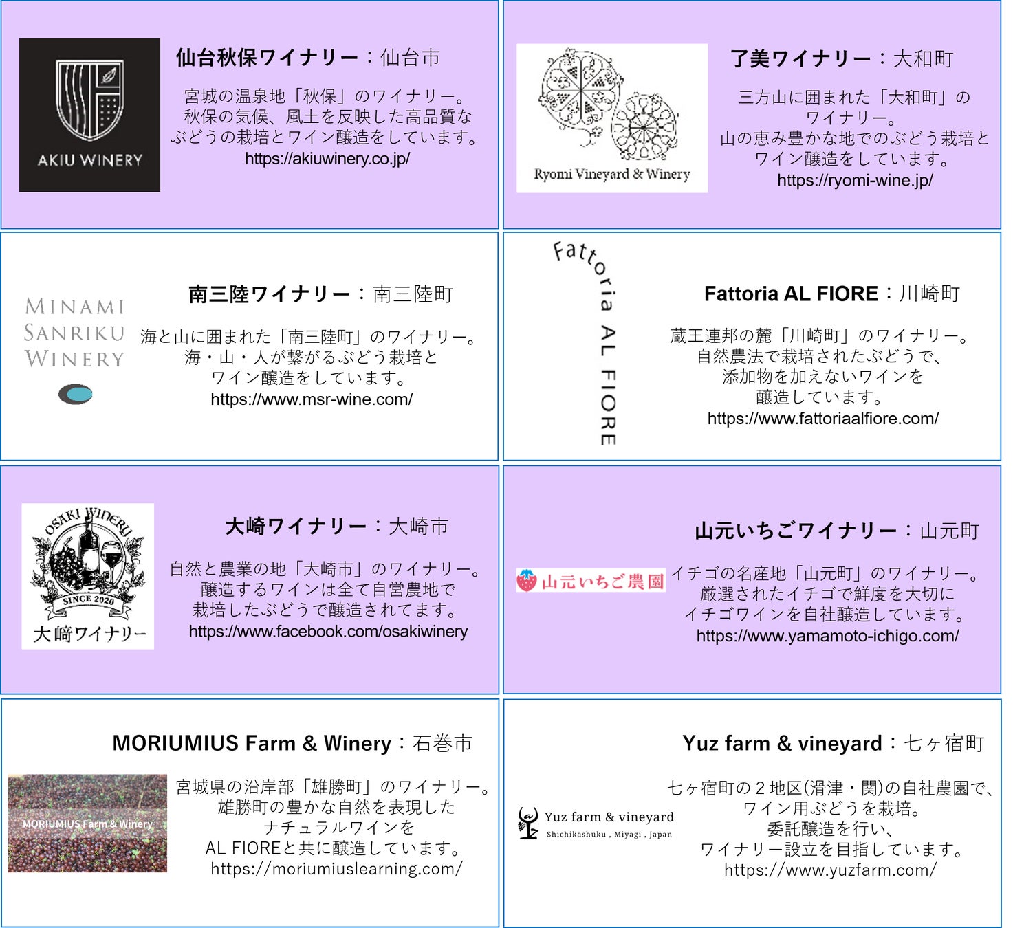 現在、宮城県内にあるワイナリーが一堂に会し、生産者自らがイベント参加者に直接ワインを振舞います。ワインブースでワインを楽しむだけでなく、ワイナリーとの対話もお楽しみいただけます。各ワイナリーから厳選されたワインを試飲でき、今年絞った新酒も登場いたします。また今回は、ニューフェイスである石巻の「MORIUMIUS Farm & Winery」、七ヶ宿の「Yuz farm & vineyard」も参加します。