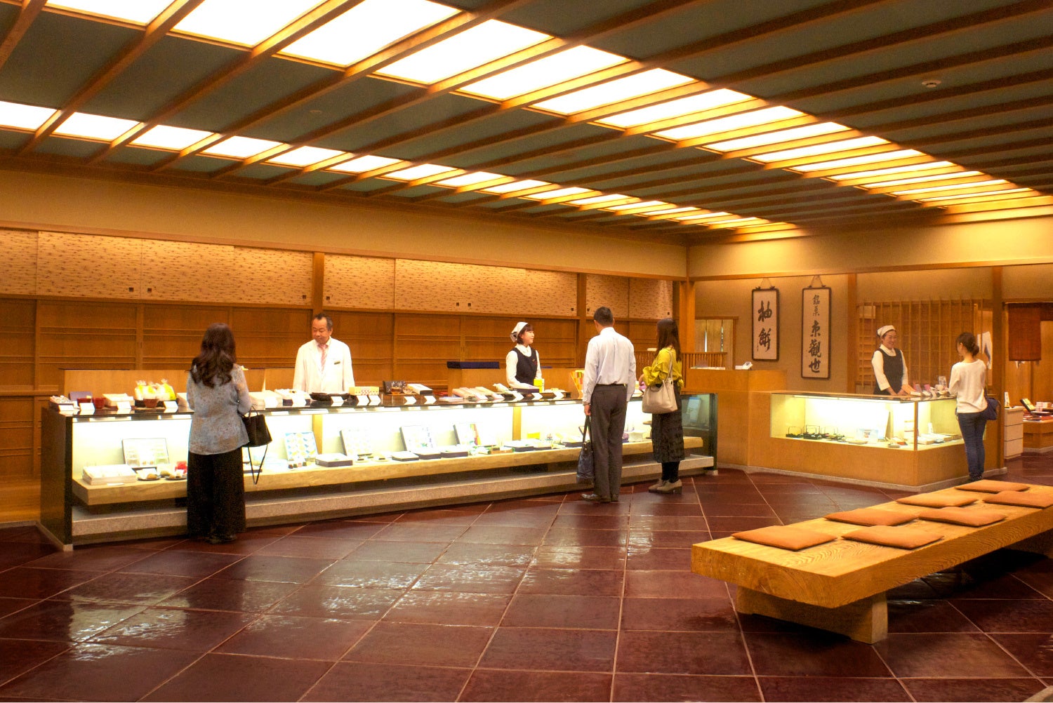 本店建物は京の伝統建築である町家の様式に数寄屋建築の粋を採り入れた、日本美の感性が匂う和の空間。1階ではお買い物を、2階では美しい茶庭をのぞむ茶寮をお楽しみ頂けます。
