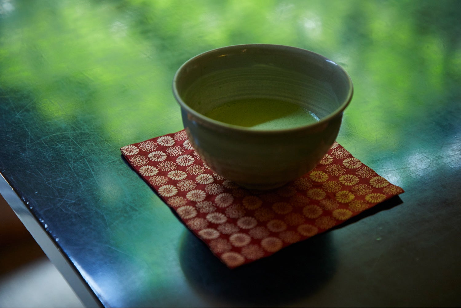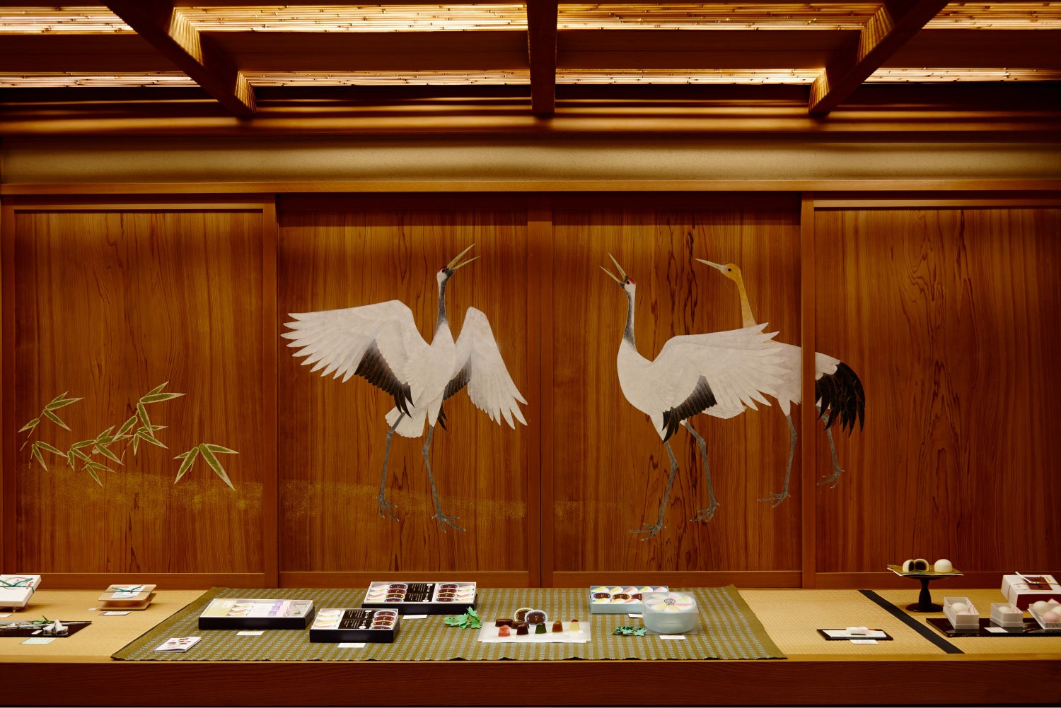まるでお寿司屋さんのようなカウンター形式のお席で、経験豊富な京菓子職人がお客様の目の前で、生菓子(上生菓子)をおつくりする実演の場。みるみるうちにできあがる季節の生菓子は新鮮で美しく、点てたてのお抹茶とともにお召し上がりいただくと格別のご体験と思い出になることと存じます。