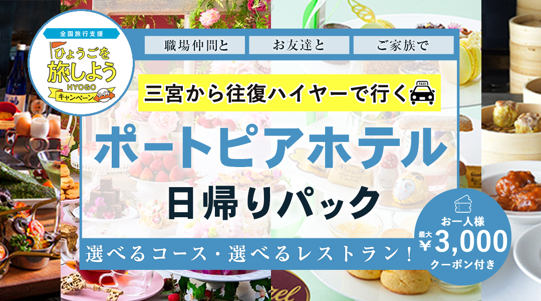 選べるポートピアホテル日帰りパックについて ポートピアホテルのレストラン5店舗から選べるコース。三宮からホテル間の往復ハイヤーとお食事がセットになったパックツアー♪ 兵庫を旅しようキャンペーンワイドを利用してお得にお食事が楽しめるプランの販売を開始いたしました。