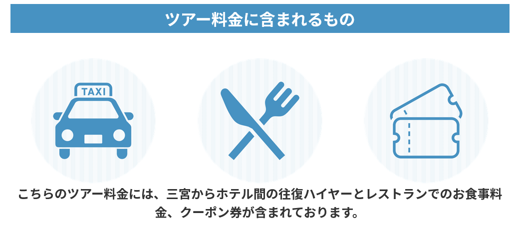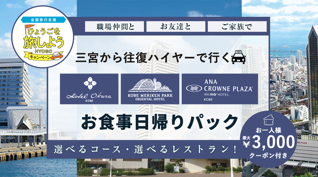 三宮~ホテル間の往復ハイヤーとお食事がセットになったパックツアーです♪全国旅行支援兵庫を旅しようキャンペーンワイドを利用してお得にお食事が楽しめるプランです。