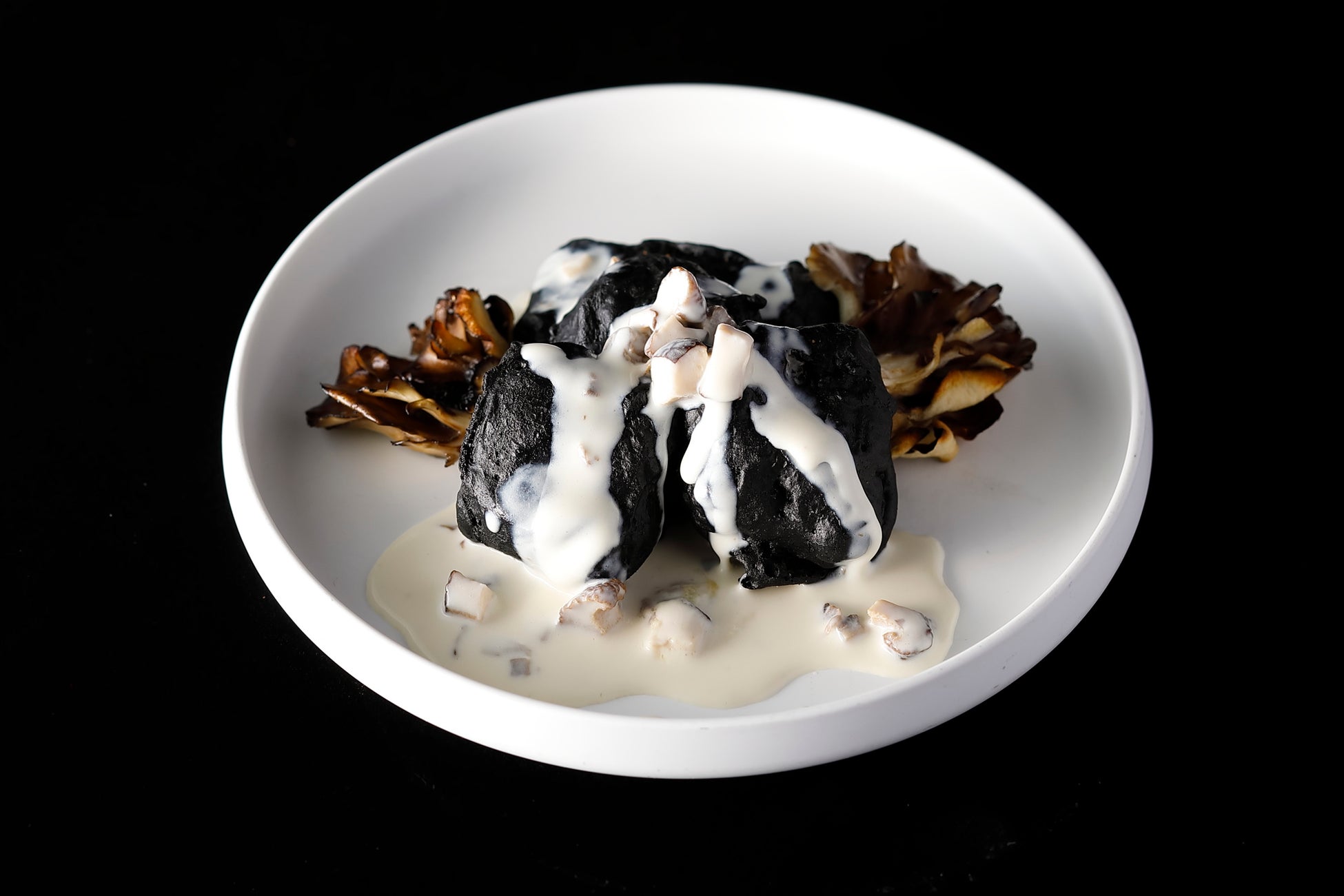 まっ黒でコクのある中国醤油をベースに紹興酒、八角等で味付けした豚肉を竹炭とイカ墨でつくる生地を纏わせじっくり揚げたフリット。秋を迎え旨味が増した食べ頃の黒マイタケの素揚げを付け合わせ、まさに“黒一色”。黒を基調とした料理にバターと白ワインにこちらにも旬のきのこを加えたデュクセルソースをあしらった、黒と白のコントラストがインパクト抜群の一皿。
