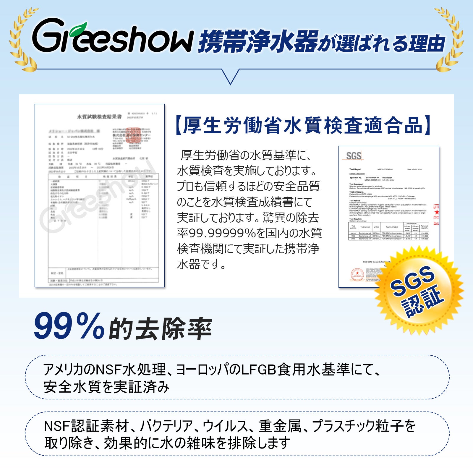 GreeShow携帯浄水器は、3段階のろ過を行なう浄水システムと超高品質のAHLSTROMフィルターを採用し、99.9999%の細菌と99.999%のウィルスを除去することができます。また、その他様々な不純物も除去することができますので、より安心・安全な水にろ過します。
