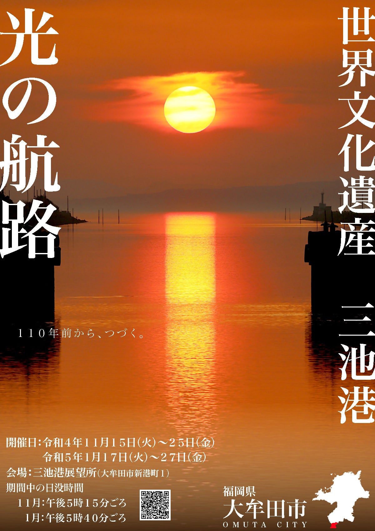 三池港展望所からは、毎年1月と11月に、三池港の航路先端から閘門を抜けて一直線となる「光の航路」を見ることができます。