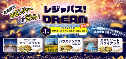 本キャンペーンは、サービスご愛顧への感謝を込めたレジャパスからのクリスマスプレゼント企画です。国内の人気レジャー施設のフリーパスチケットが多くの方に当たります。全4弾で応募期間を分けて開催し、レジャパス会員なら誰でも応募することができます。また、レジャー施設を希望順で応募できるほか、家族会員分も含めた応募が可能です。
