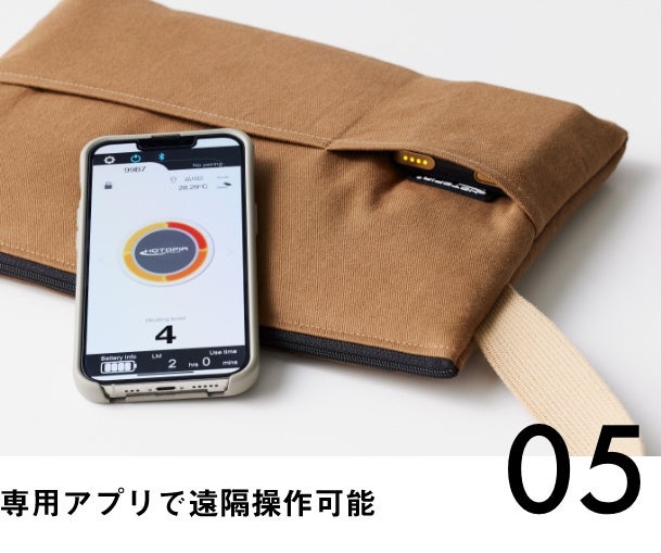 (5)バッテリー専用のアプリ「HOTOPIA」をインストールすると、アプリから温度調節が可能に。他のHOTOPIA製品でももちろん使用する事が可能です。