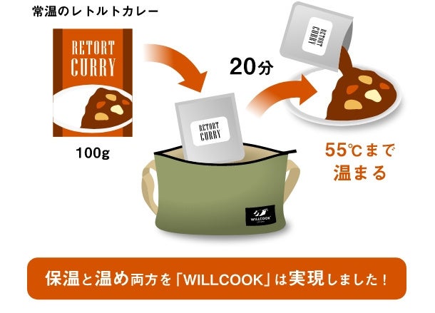 さらに、常温のレトルト食材を「WILLCOOK®」に入れておくことで、大人がおいしいと感じる55℃まで温めることも可能!保温と温め両方を「WILLCOOK®」は実現しました!