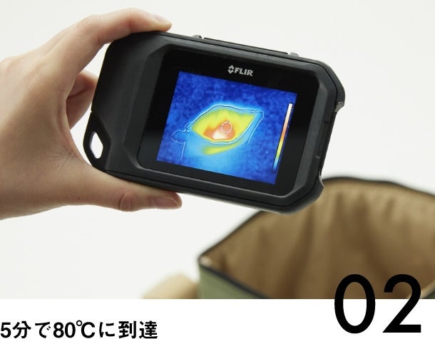 (2)繊維自体が発熱するから通常の布と同じ柔軟性・軽量性を持ちながら、素早く均一な温かさを実現。さらに調理器具の保温に使用されている保温効果の高い断熱中綿と、遮熱効果の高いアルミフィルムをプラスする事で高い保温力を保持する事ができる構造となっています。