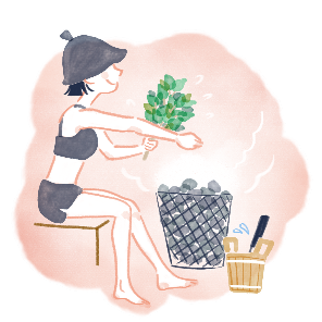 | *白樺ヴィヒタ:白樺の若い枝葉を束ねたもの。 *ウィスキング:ヴィヒタで全身を叩いたり、なでたりするマッサージのことや血行を促進したり白樺の香りを楽しむこと。 |