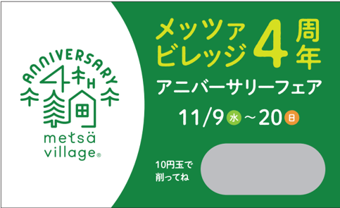 埼玉県飯能市にある国内最大級の北欧ライフスタイル体験施設「メッツァビレッジ」は、みなさまのおかげで11月9日に4周年を迎えます。これを記念して、11月19日(土)、11月20日(日)の2日間、豊かな自然に包まれた宮沢湖を背景に、「4thアニバーサリーウィークエンド」を開催いたします。また11月9日(土)~11月20日(日)の期間、抽選で素敵なプレゼントが当たる「アニバーサリーフェア」を実施いたします。