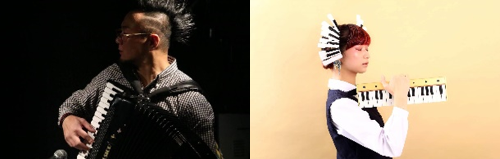 | 出演者プロフィール ・都丸智栄(アコーディオン) 立命館大学在学中に、アコーディオンに出会い弾き始める。その後、アコースティックトリオ【ザッハトルテ】を結成。東西ヨーロッパの要素を取り入れたオリジナリティ溢れる楽曲を、カフェ、美術館、ホール、ライブハウスなど様々な場所で演奏。2020年から配信活動も始め、年間ライブ本数は年間150本以上! 参加作品▶︎ アフラック『アヒルのワルツ』『持病の歌』の演奏、テレビ東京【美の巨人たち】テーマソング演奏 NHK連続テレビ小説《おちょやん》劇伴演奏、久石譲【第九、風立ちぬコンサート】にてソリスト 出演掲載▶︎【おかあさんといっしょ】大ヒット曲の『ドコノコノキノコ』作曲編曲演奏コーラス、NHK連続テレビ小説《わろてんか》 ・南川朱生(鍵盤ハーモニカ) |