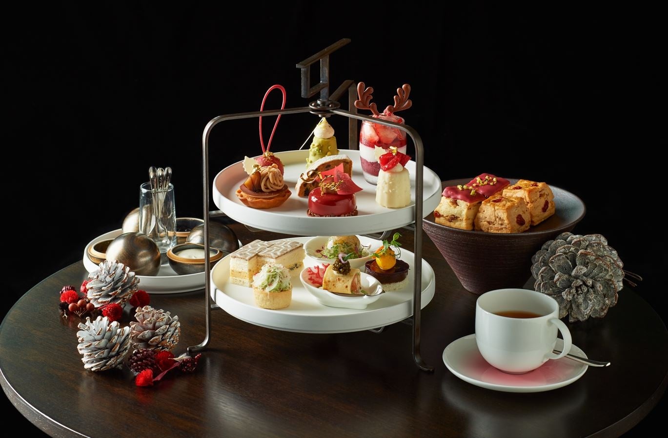 フェスティブシーズン限定のアフタヌーンティーは赤く煌めくスイーツを中心に、細かなディテールに歓喜溢れる品々をご用意いたしました。トナカイの角が愛らしいグラスデザートや、ピスタチオのムースやチョコレートで作った淡いグリーンのミニツリーなど、遊び心溢れた心温まるスイーツも取り揃えております。下段にはキャビアやトリュフを使った贅を尽くしたセイボリー5品も並び、ホテルのフェスティブらしく華やいだ時間へと導きます。