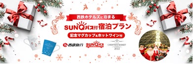 宿泊と「記念マグカップ&ホットワインチケット」がセットになったお得なプランを販売いたします。また、西鉄旅行では、SUNQパスが付いたプランもご用意しております。