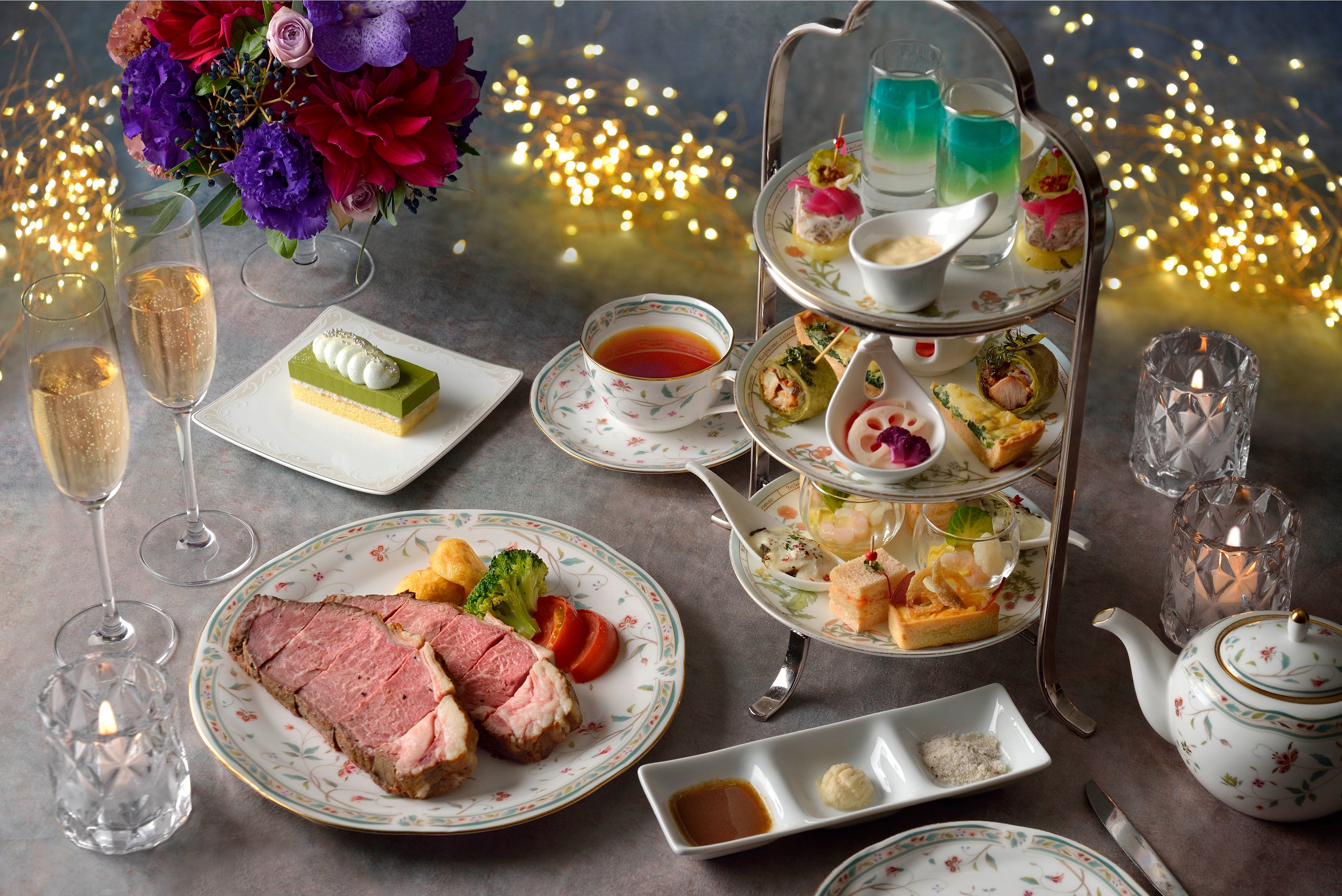 三段のオードブルスタンド、ローストビーフ、デザートのついた人気のイブニングハイティー。東京雲海とオーロラの絶景を体験できる冬の庭園演出「森のオーロラ」にちなんだ「オーロライブニングハイティー」を期間限定でご提供いたします。ル・ジャルダンで優雅な大人の時間を過ごし、お食事の前後には庭園でオーロラの美しい景色をお楽しみください。