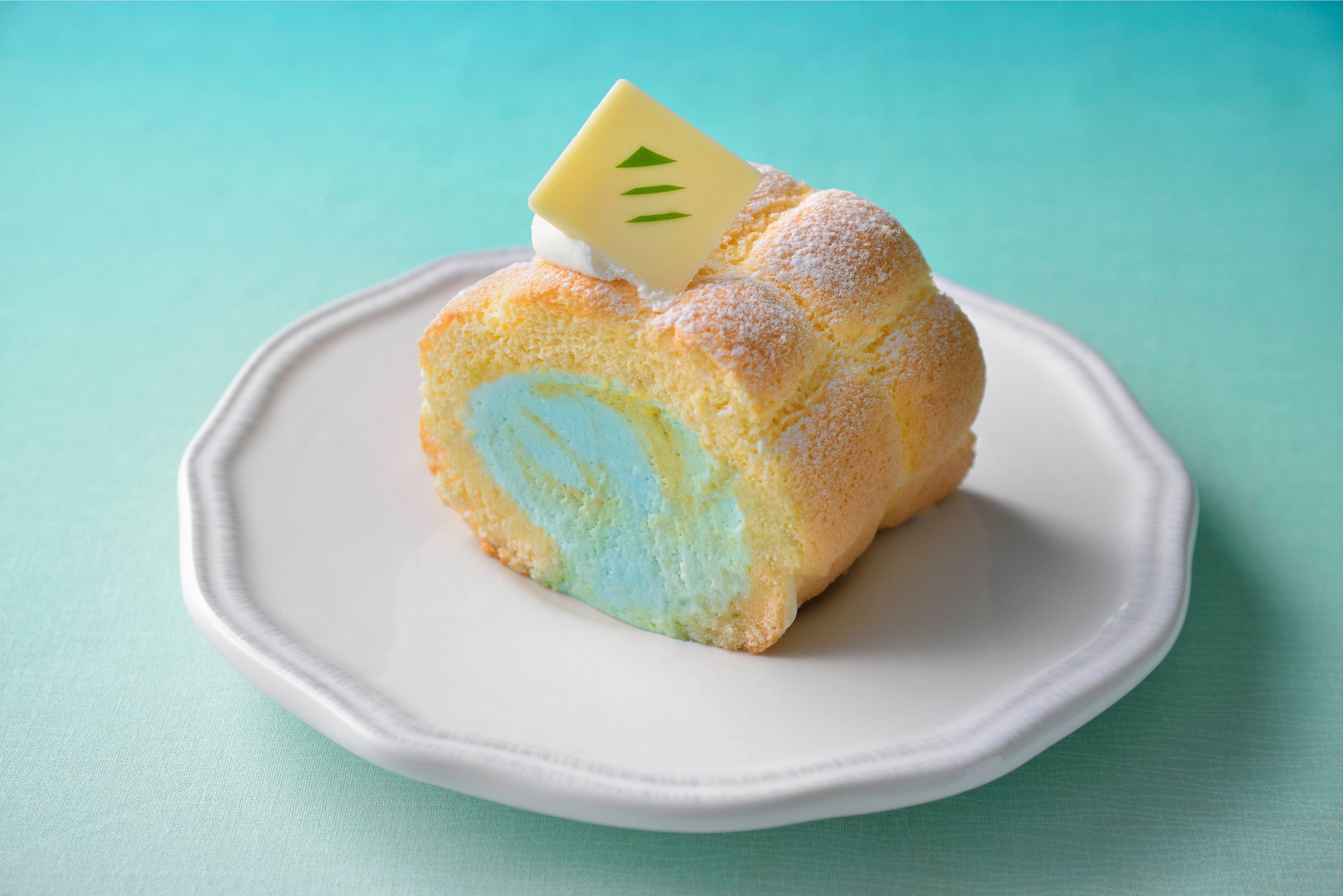 空気をたくさん含ませた軽くて優しいクリームを、マスカットのような香りを感じるエルダーフラワーシロップを染み込ませたビスキュイでたっぷりとロールしました。コクのあるバタフライピークリームとピスタチオクリームがオーロラの景色を再現しています。