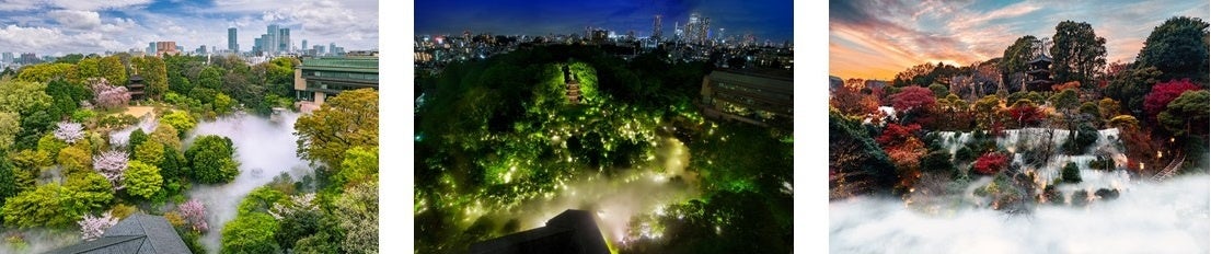 本年11月の開業70年に向けて、2020年より3カ年計画で「庭園プロジェクト」を始動。「いつの時代も、その時代が必要とするオアシスであり続ける」というコンセプトの下、2020年に日本の高い技術で作られたノズルを用い、雲と同じ細かい水粒を発生させて造る霧と、歴史ある庭園の自然を融合させた、国内最大級の霧の庭園演出「東京雲海」を開始しました。さまざまな条件が整わなければ発生しない自然雲海の風情を、東京にいながら毎日ご体感いただける“見て”“触れられる”奇跡の絶景を創り出しました。