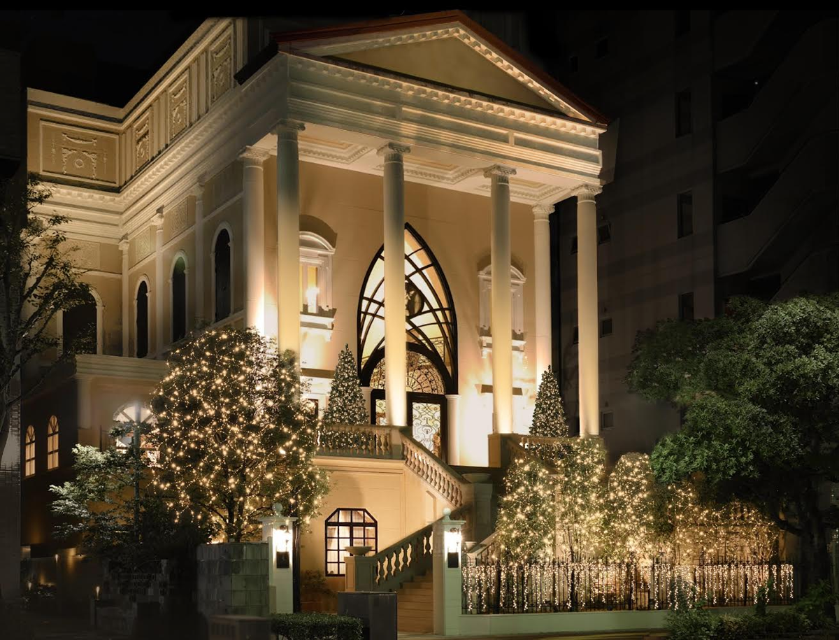 赤坂ル・アンジェ教会が華やかなシャンパンゴールドのイルミネーションとクリスマスのオーナメントで彩られます。