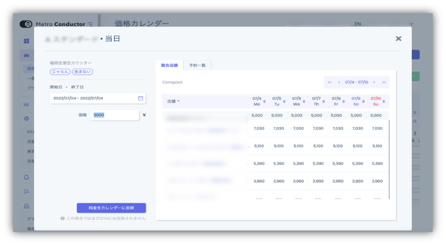 OTA・店舗・車両クラス・出発日を指定することで、競合店舗の当日、1泊2日、2泊3日、3泊4日の販売価格を一覧できます。