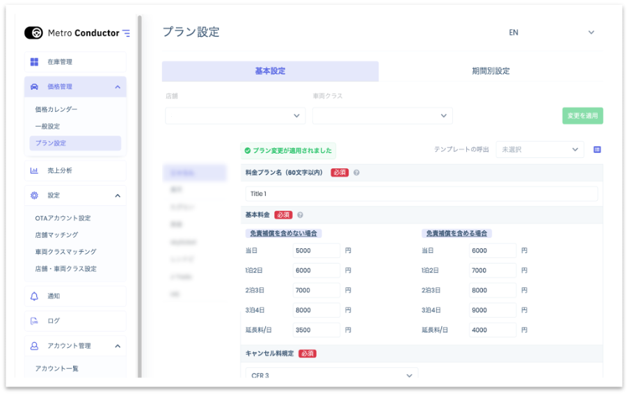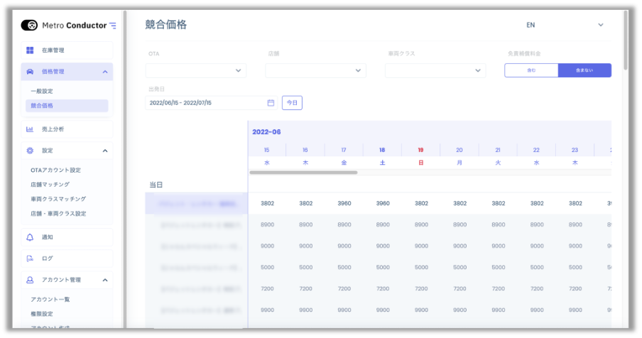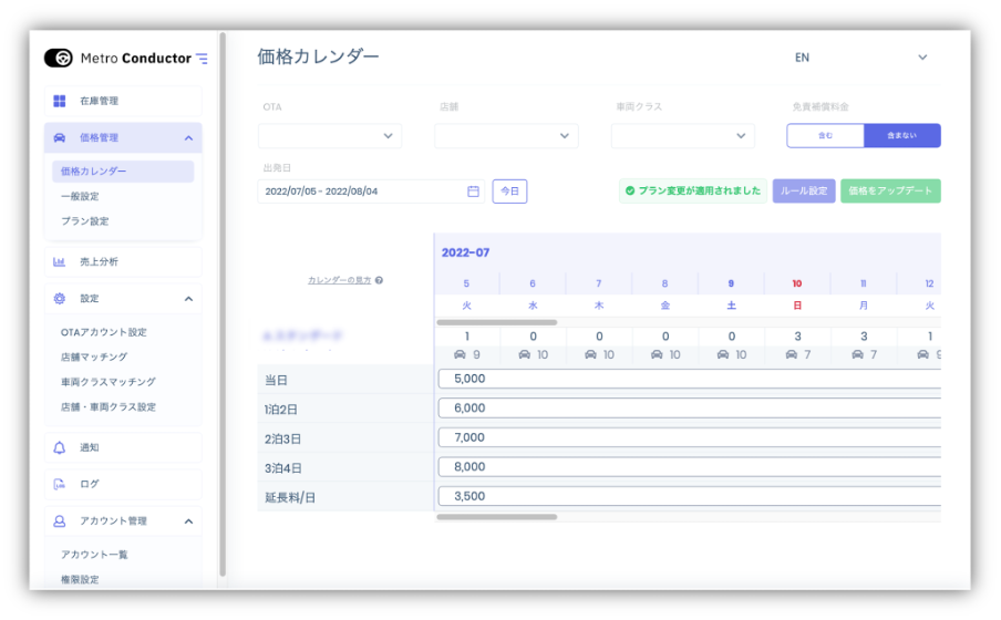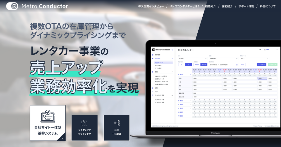 ダイナミックプライシングサービスを提供するメトロエンジン株式会社(本社:東京都品川区、代表取締役CEO:田中良介、以下メトロエンジン)は、Webでの在庫管理などレンタカー事業運営をサポートする「メトロコンダクター」の新機能としてダイナミックプライシング機能(価格管理機能)の提供を本日より開始いたしました。レンタカー業界におけるダイナミックプライシングの提供はメトロコンダクターが初となり、事業者は自社のニーズ・課題に基づいて3種類のプランより選択することができます。これにより、レンタカー事業者は需要予測に基づいた販売価格の設定が容易になるほか、複数OTAサイトの在庫まで一気通貫で管理することが可能になります。