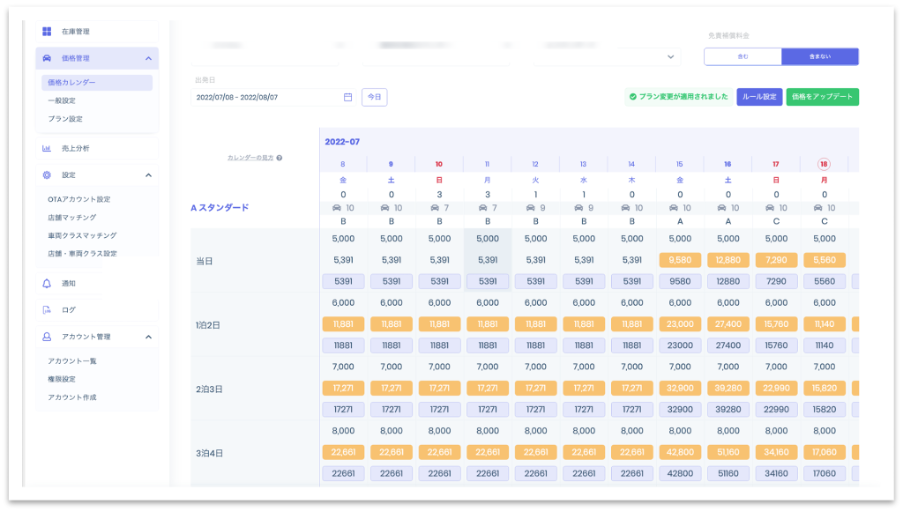 オートプライスモードでは、競合店舗の販売価格や貸渡日までのリードタイム、残在庫数をもとに店舗独自のルールを設定することで需要に応じた価格を自動で算出し、プランに反映させる、本格的なダイナミックプライシングが可能です。また、マニュアルモードと同様、簡便なプラン作成機能により、管理業務の手間を大幅に削減できます。