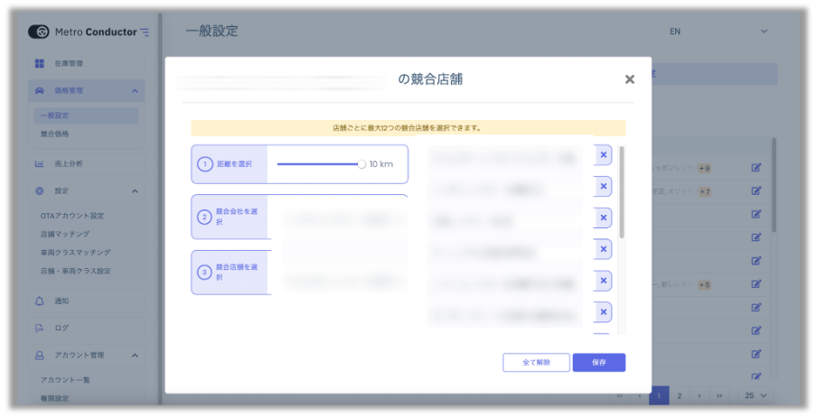 競合価格を閲覧するための準備として、競合店舗を登録します。自店舗からの距離をもとに自店舗が競合と認識している店舗を選択します。