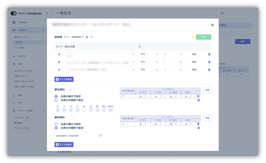 販売価格のルール設定ページにて、事前に設定した競合店舗の販売価格の平均・最大・最小と四則演算を組み合わせて、独自の計算ルールを設定することができます。計算ルールは複数設定することができ、設定した後は曜日ごとに適用するルールを変えたり、貸渡日までのリードタイムと残在庫数を加味してどのルールを適用するか決められます。また適用するルールには優先順位をつけることができ、貸渡日までのリードタイムと曜日のルール適用が同じ日に重なる場合にも柔軟なルール設定が可能です。
