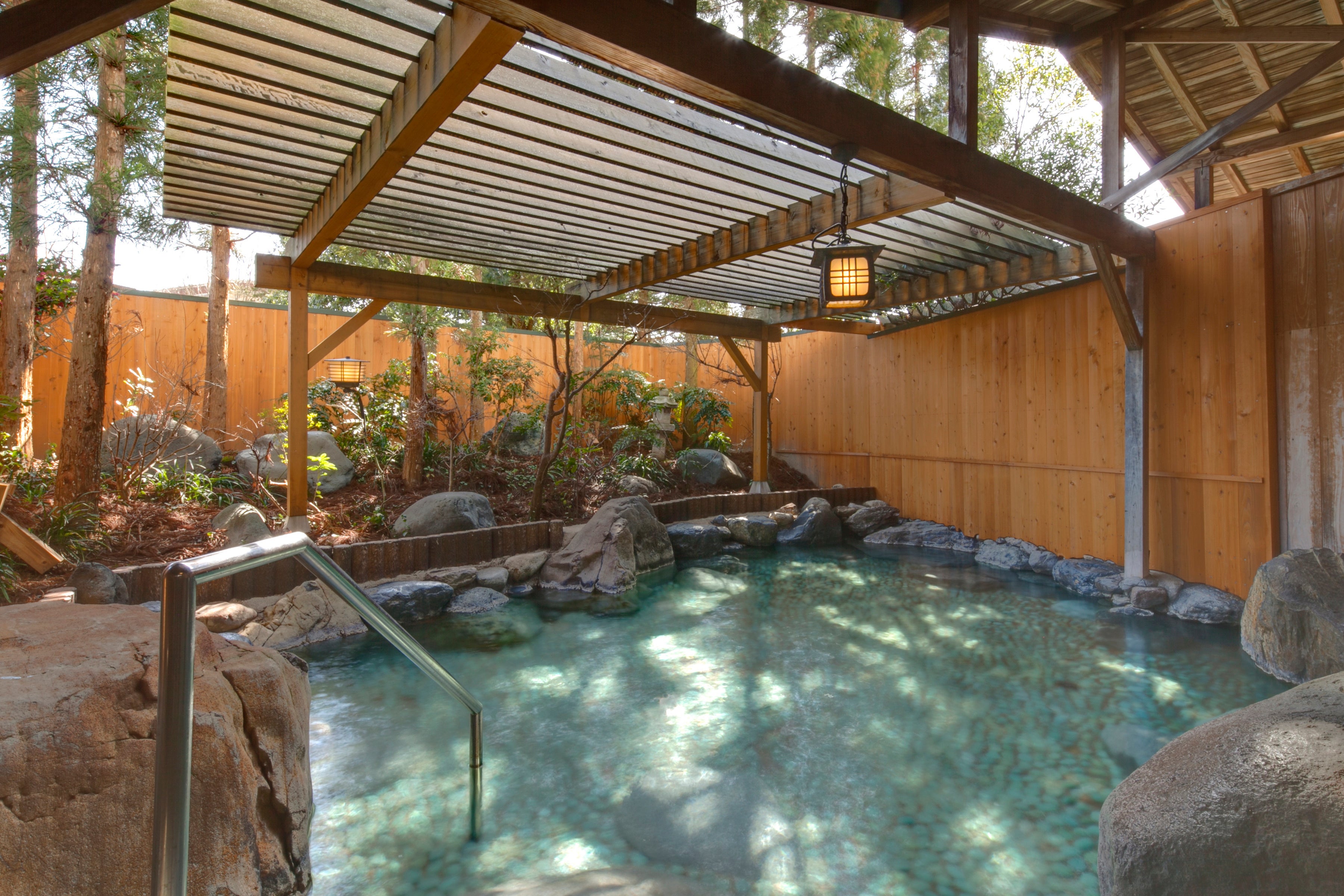 併設の大露天風呂は緑豊かな和の庭にあり、あふれるほどの湯と湯けむりとあいまって、