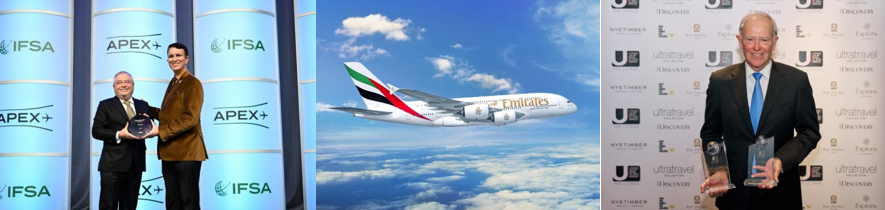 旅行業界の多くの著名なメンバーとともに、エミレーツ航空社長のティム・クラーク卿は英国ロンドンで開催されたULTRAの授賞式に出席し、リテール兼機内エンターテインメント兼接続環境担当副社長のパトリック・ブラネリーは米国カリフォルニアのAPEX授賞式に出席しました。