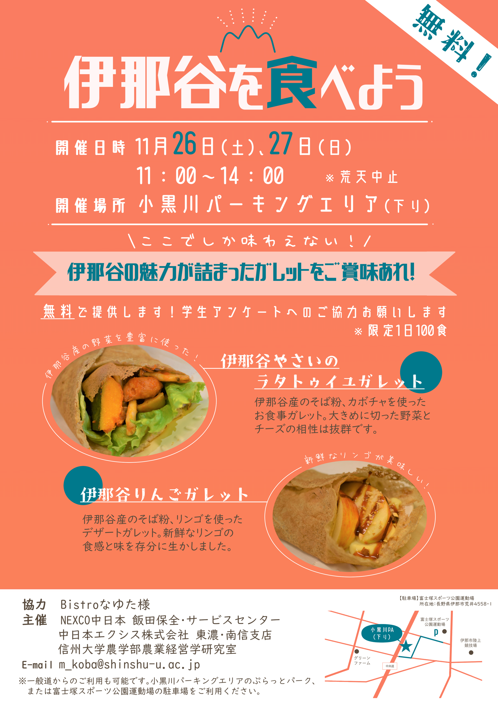 NEXCO中日本 名古屋支社 飯田保全・サービスセンター(長野県飯田市、所長・藤野(ふじの)友裕(ともひろ))、中日本エクシス株式会社 東濃・南信支店(岐阜県恵那市、支店長・髙野(たかの)智治(ともはる))および信州大学農学部(長野県上伊那郡南箕輪村、学部長・米倉(よねくら)真一(しんいち))は、地域連携事業の一環として、伊那谷の農林産物の消費拡大や観光客の増加を図り、農村振興を目指すことを目的とした共同研究を進めてきました。これに伴い、E19 中央自動車道(中央道)小黒川(おぐろがわ)パーキングエリア(PA)(下り)で地域連携イベントを開催いたします。