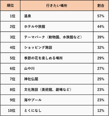 家族での旅行に限らず、国内の旅行先として大人気の温泉が1位となりました。温泉にゆっくり浸かって癒されるのはもちろん、家族で温泉街を歩いたり、周辺観光スポットを巡る楽しさもあります。